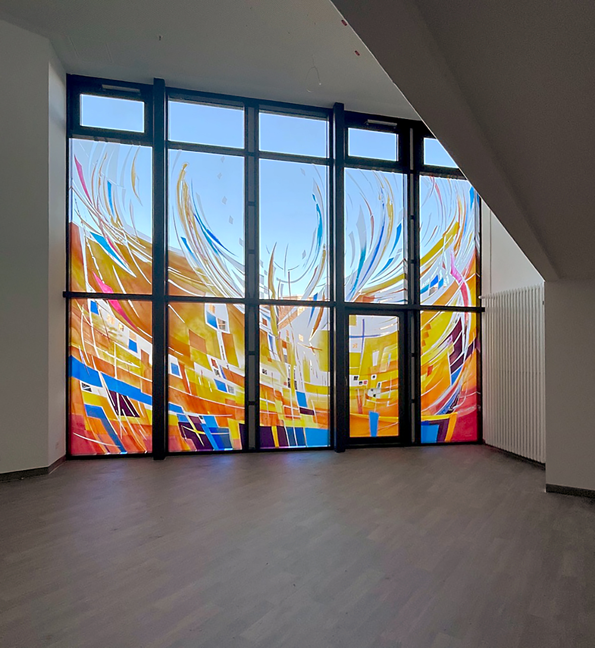 Entwurf: Jörgen Habedank, 2021 Auftraggeber: Liegenschaftsamt Greifswald Ausführung: Glasmalerei Peters, Paderborn Größe: ca 10 x 3 m |